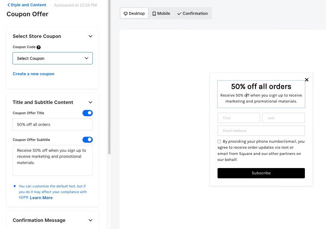 Square's Coupon Pop-Ups let you share special offers with your visitors right when it matters most. Choose from the same user-friendly layouts as the email pop-ups (Layout #1-#4 are available) and create consistent campaigns.